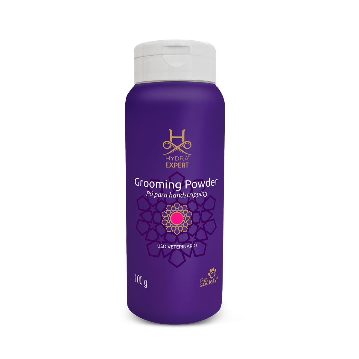 Modo de uso: Aplique uma pequena quantidade do HYDRA Expert Grooming Powder sobre os pelos da região desejada e inicie o procedimento de handstripping ou depilação de orelhas.